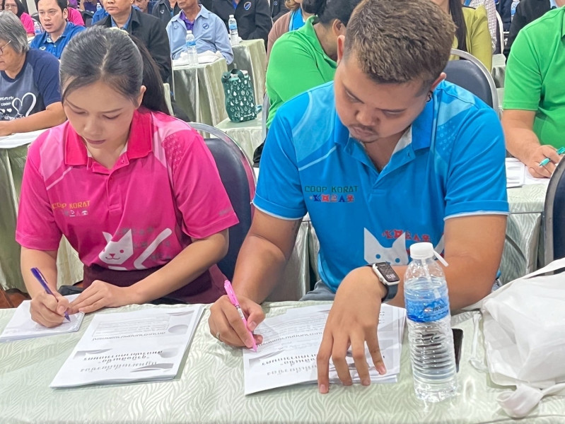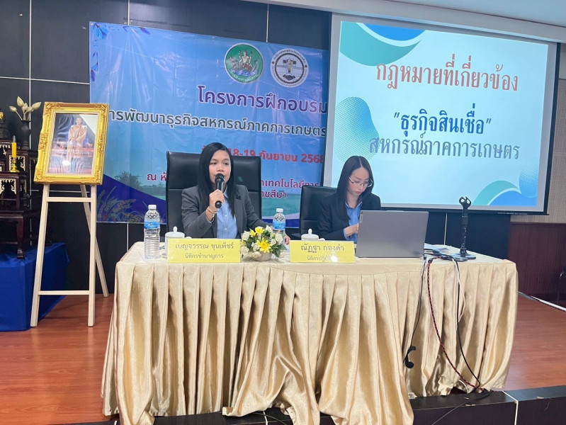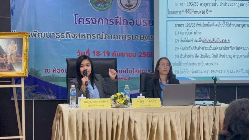 วันที่ 19 กันยายน 2568 นายปริญญา เศวตธรรม ผู้อำนวยการศูนย์ถ่ายทอดเทคโนโลยีการสหกรณ์ที่ 5 จังหวัดนครราชสีมา พร้อมคณะทำงานร่วมกับสันนิบาตรสหกรณ์จังหวัด นครราชสีมา ร่วมจัดโครงการฝึกอบรม หลักสูตร “การพัฒนาธุรกิจสหกรณ์การเกษตรเพื่อความยั่งยืน”กำหนดโครงการฝึกอบรมจำนวน 2 วัน 18-19 กันยายน2568 โดยมีวิทยากรบรรยายช่วงเช้า “กฎหมายที่เกี่ยวข้องในการดำเนินธุรกิจของสหกรณ์ภาคการเกษตรและการไกล่เกลี่ยก่อนฟ้อง”โดยนางสาวเบญจวรรณ ขุนเพ็ชร์ นิติกรชำนาญการและนางสาวณัฏฐา กองคำ นิติกรปฏิบัติการ สำนักนายทะเบียนและกฎหมาย วิทยากรบรรยายช่วงบ่าย “เทคนิคการติดตามและการป้องกัน,การแก้ไขปัญหาหนี้ค้าง ”โดย นายทวีรัตน์ ฟุ้งสันเทียะิผู้จัดการสหกรณ์การเกษตรขามสะแกแสง จำกัด มีผู้เข้าอบรมจำนวน 99 คน ณ ศูนย์ถ่ายทอดเทคโนโลยีการสหกรณ์ที่ 5 จังหวัดนครราชสีมา